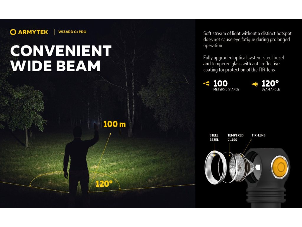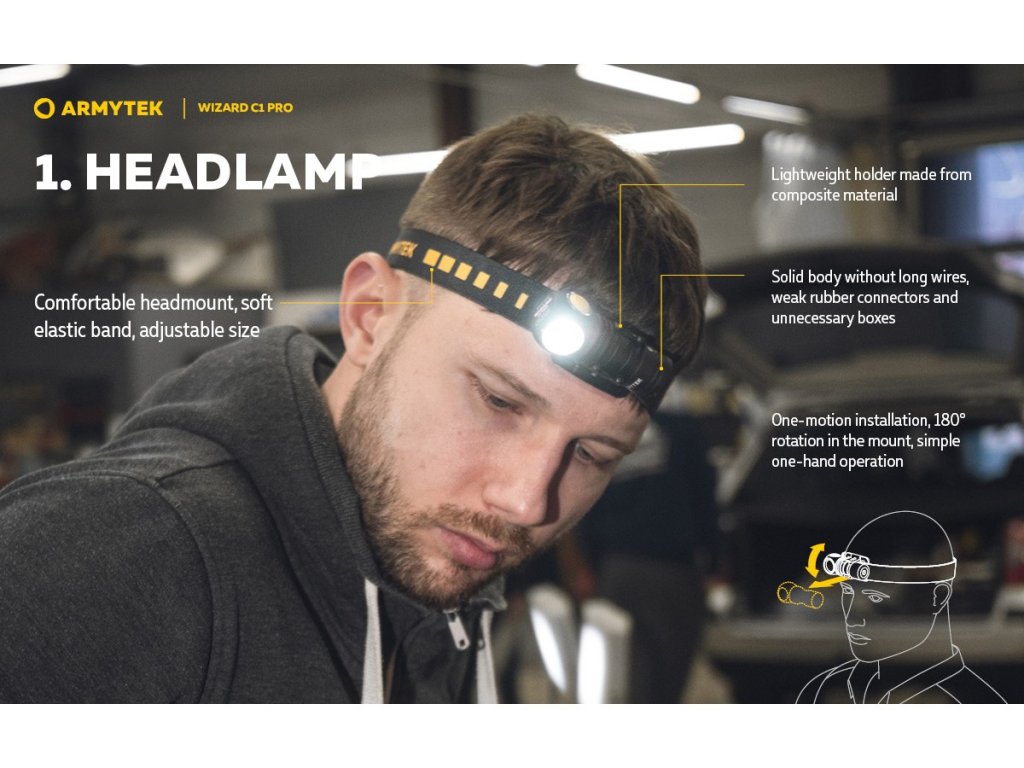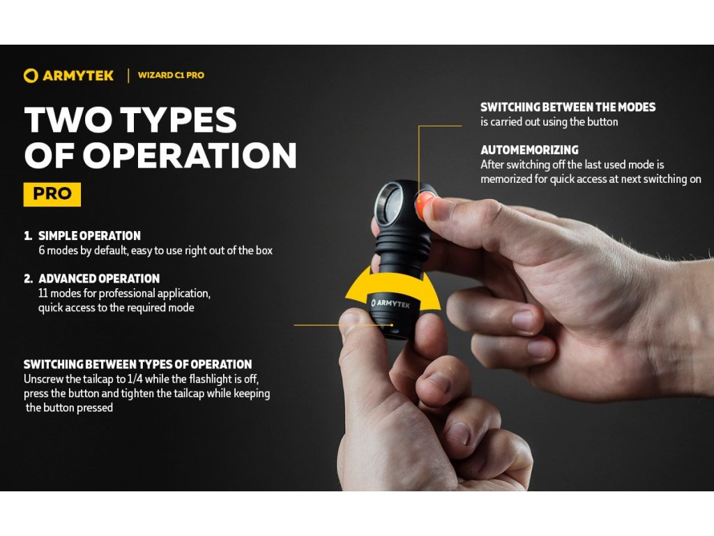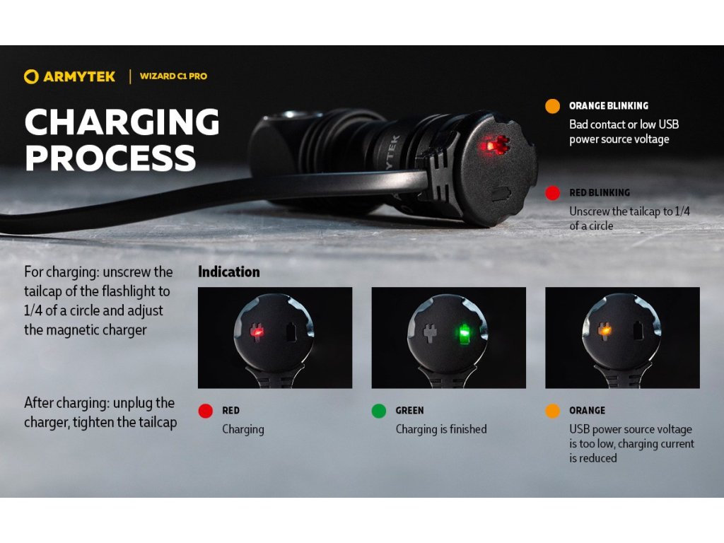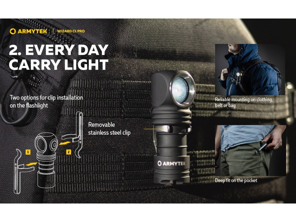 VLASTNOSTI: - 11 režimov svietenia vrátane stroboskopu - Prevádzkový čas max. režim: 55min (po 5 min. sa svietivosť zníži na 500 lm) - Prevádzkový čas min. režim: 60 dní - Indikácia nízkej úrovne nabitia batérie - Farebná indikácia stavu batérie - Nutné používať batérie bez PCB! PARAMETRE: Svetelný tok: 1000 lm Dosvit: 100 m Farba svetla: Studená biela (White light) Napájanie: 18350 Li-ion Krytie: IP68 Rozmery: 33x20x76 mm Hmotnosť: 80 g (vrátane akumulátora) OBSAH BALENIA: 1x Multifunkčná baterka Armytek Wizard C1 Pro Magnet USB 1x Nabíjateľná lítium-iónová batéra 18350 (900mAh) 1x USB magnetický nabíjací kábel 1x Čelenka 1x Oceľový klip na opasok 2x Náhradné tesnenieDodatočné parametre
