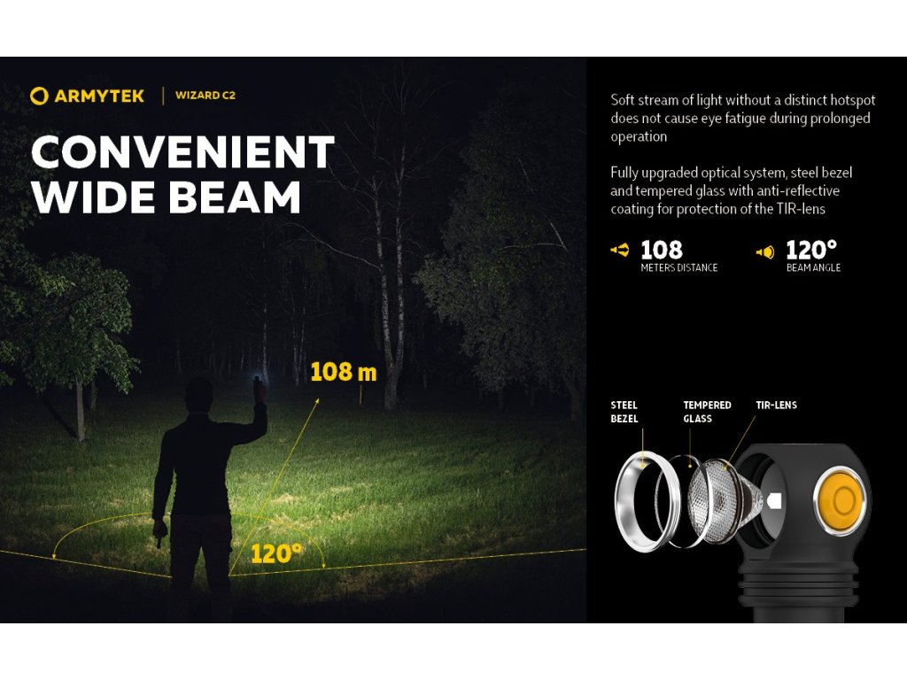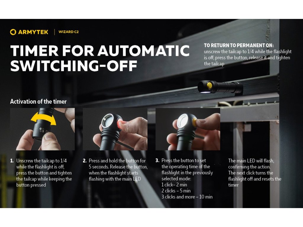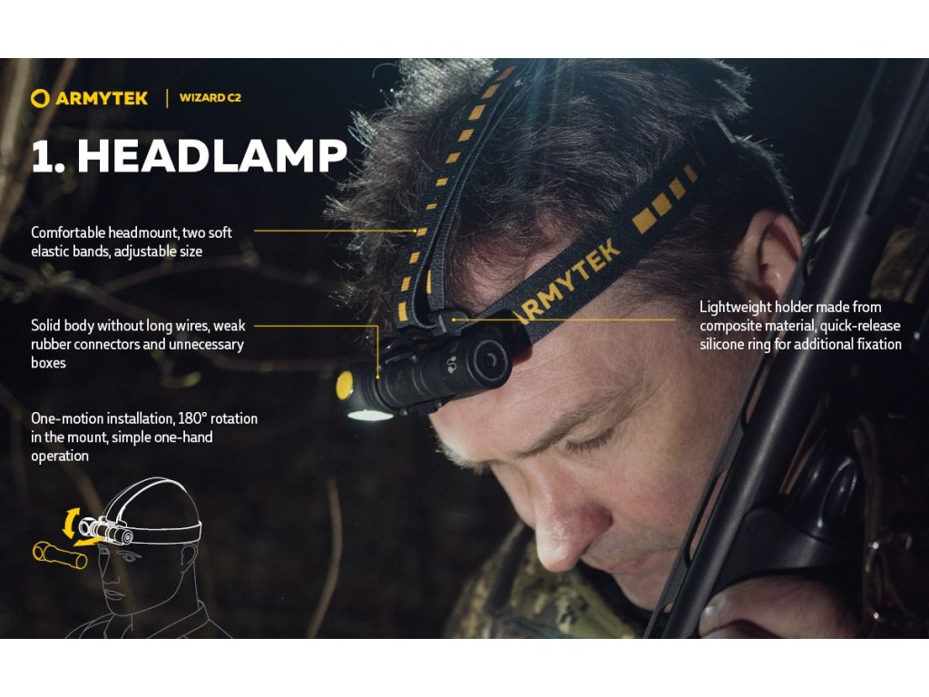 VLASTNOSTI: - 6 režimov svietenia vrátane stroboskopu + časovač automatického vypnutia - Prevádzkový čas max. režim: 2h 45min (po 4 min. sa svietivosť zníži na 580 lm) - Prevádzkový čas min. režim: 200 dní - Indikácia nízkej úrovne nabitia batérie - Možné používať batérie bez PCB i s PCB PARAMETRE: Svetelný tok: 1200 lm Dosvit: 108 m Farba svetla: Studená biela (White light) Napájanie: 18350 Li-ion Krytie: IP68 Rozmery: 33x20x112 mm Hmotnosť: 114 g (vrátane akumulátora) OBSAH BALENIA: 1x Multifunkčná baterka Armytek Wizard C2 Magnet USB 1x Nabíjateľná lítium-iónová batéra 18650 (3500mAh) 1x USB magnetický nabíjací kábel 1x Čelenka 1x Oceľový klip na opasok 2x Náhradné tesnenieDodatočné parametre