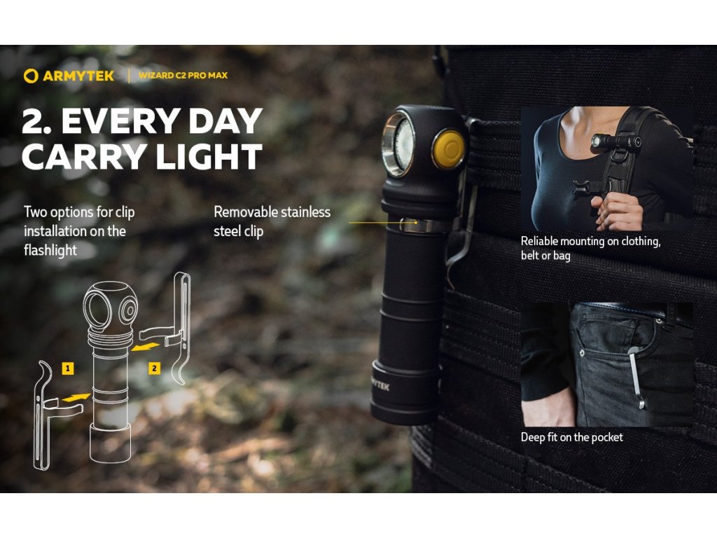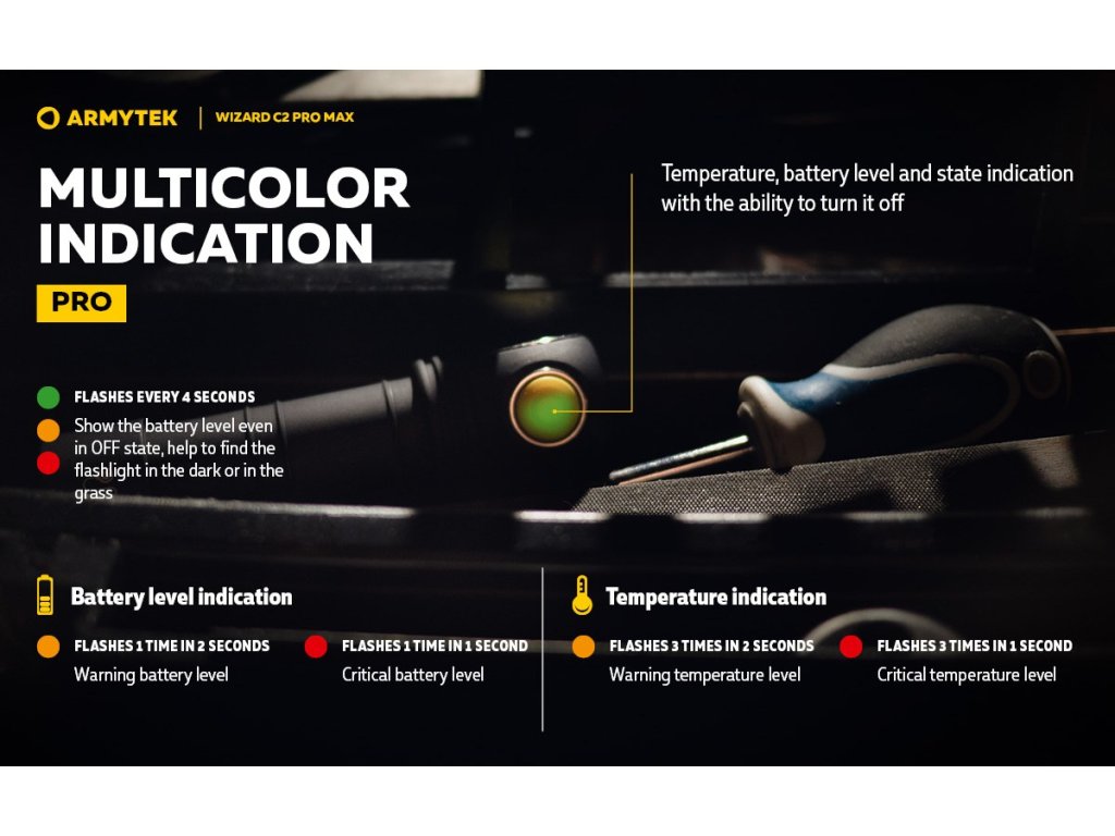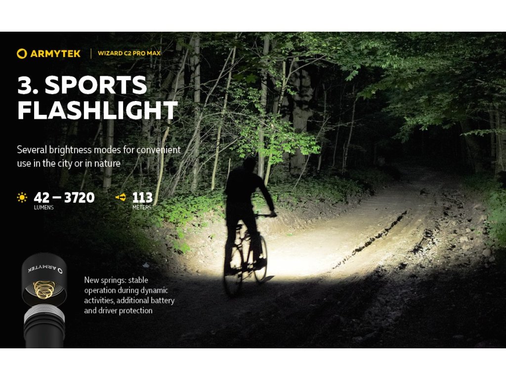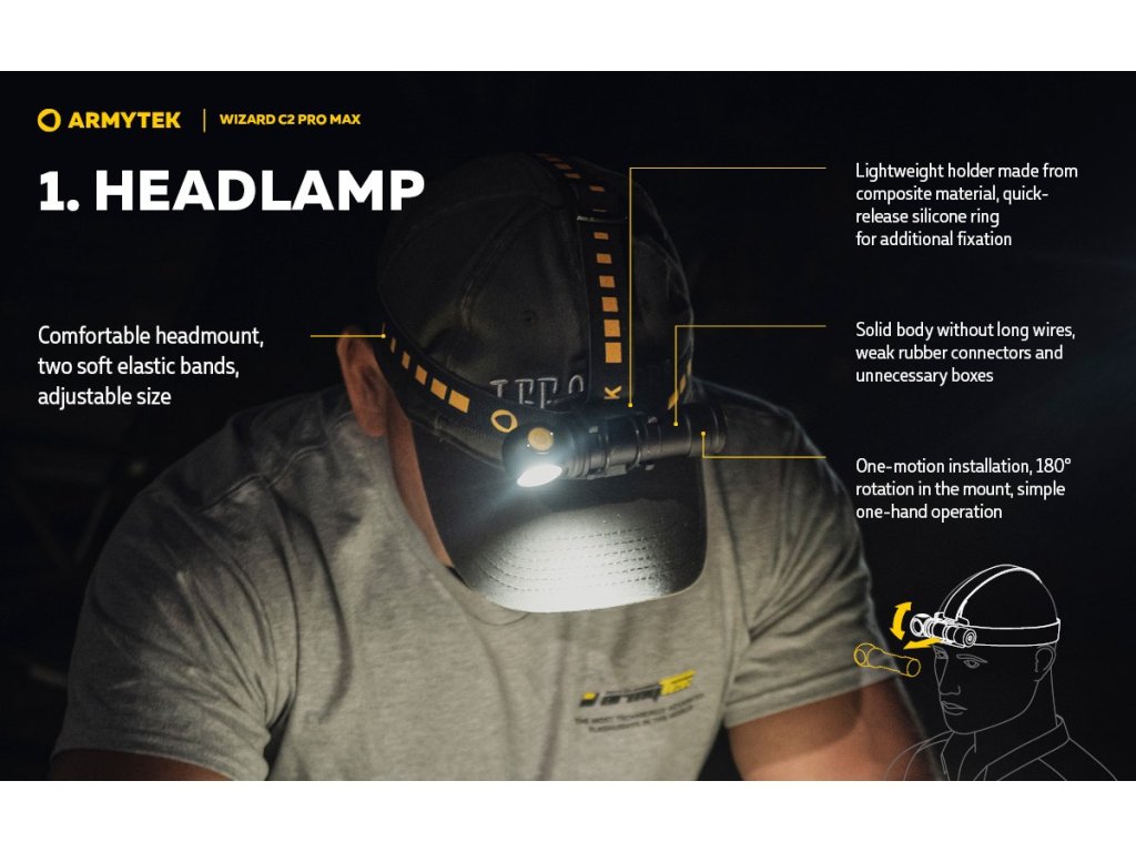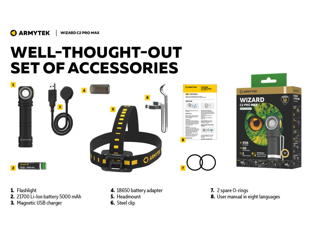 VLASTNOSTI: - 6 režimov svietenia - Prevádzkový čas max. režim: 3h 15min (po 50 sec. sa svietivosť zníži na 840 lm) - Prevádzkový čas min. režim: 2 mes. - Indikácia nízkej úrovne nabitia batérie - Farebná indikácia stavu batérie - Možné používať batérie bez PCB i s PCB PARAMETRE: Svetelný tok: 3720 lm Dosvit: 113 m Farba svetla: Teplá biela (Warm light) Napájanie: 1x21700 Li-ion, 1x18650 Li-Ion (s adaptérom) Krytie: IP68 Priemer tubusu: 23.6 mm Rozmery: 34x34x122 mm Hmotnosť: 149 g (vrátane akumulátora) OBSAH BALENIA: 1x Multifunkčná baterka Armytek Wizard C2 Pro Max Magnet USB 1x Nabíjateľná lítium-iónová batéra 21700 (5000mAh) 1x Adaptér na batériu 18650 1x USB magnetický nabíjací kábel 1x Čelenka 1x Oceľový klip na opasok 2x Náhradné tesnenieDodatočné parametre