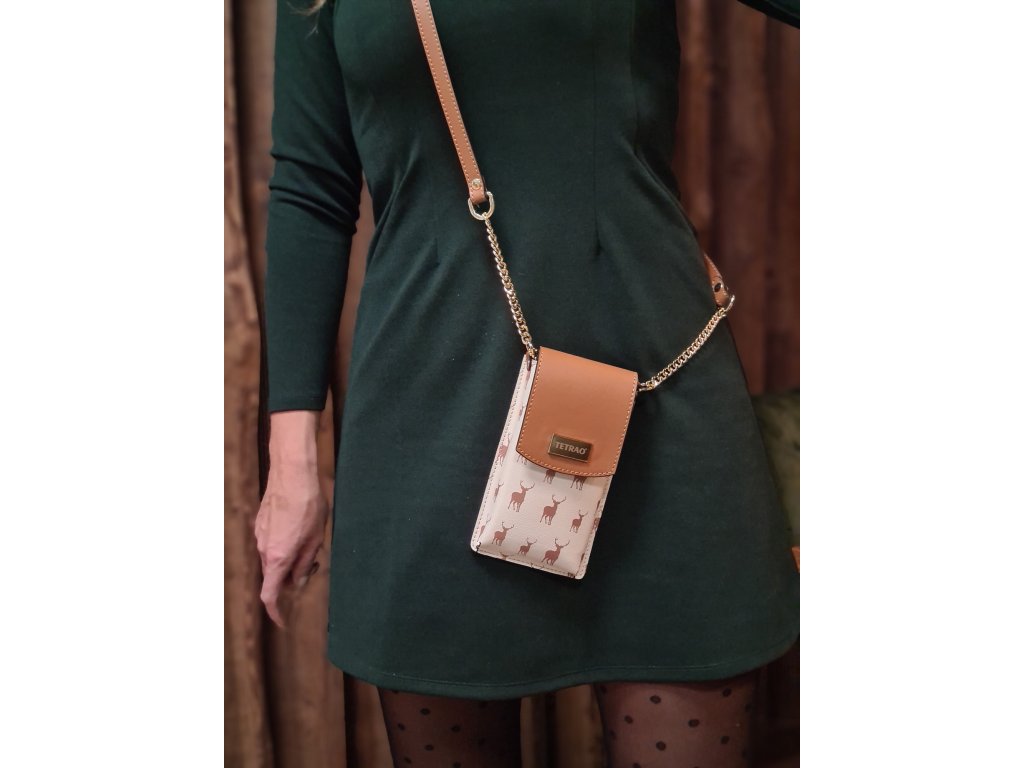 Mobil sa dá nosiť aj štýlovo, a to v jedinečnej koženej mini kabelke. Ukryje smartfón akejkoľvek veľkosti. Šikovná TETRAO Rosa doplní outfit na ples alebo len tak do mesta. Vyrobená je z exkluzívnej talianskej kože s jedinečnou potlačou s motívom jeleňov. V interiéri mini kabelky ťa čaká jemné vnútro z brúsenej kože a jedna priehradka na kreditnú kartu. Uzatvára sa pomocou patentky. Kožený popruh so zlatými prvkami je kombinovaný retiazkou. Popruh je možné prispôsobiť na požadovanú dĺžku. Môže byť tvojím nadčasovým kúskom rovnako ako kvet ruže (lat. Rosa), ktorej názov nesie.