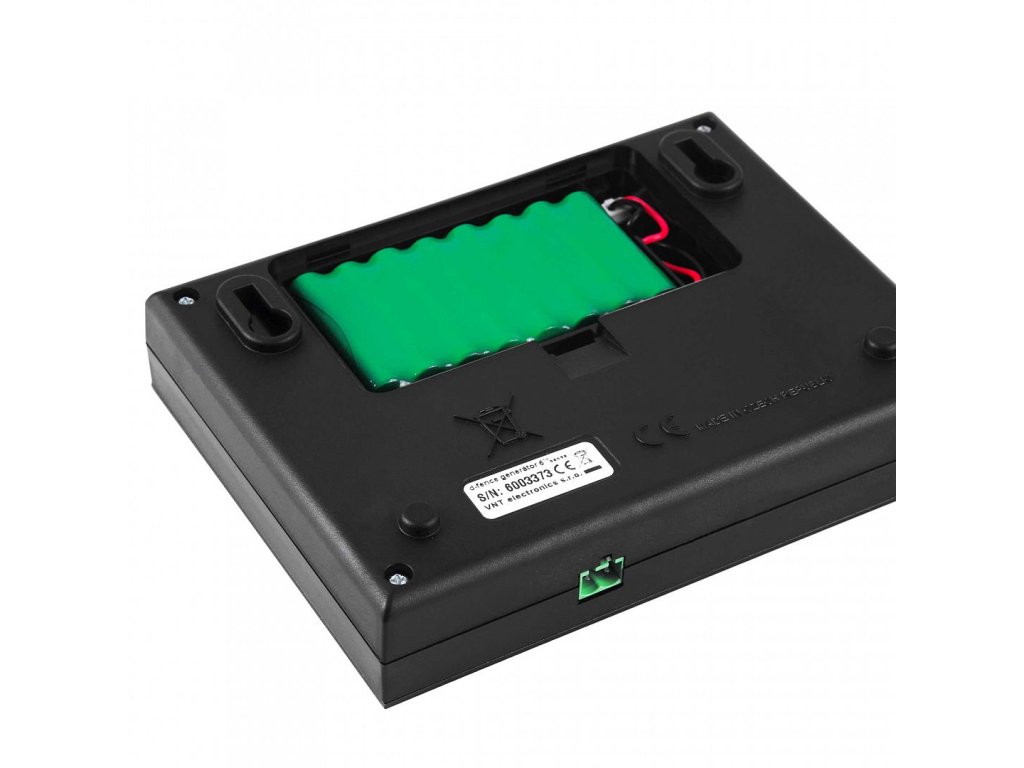 záložný akumulátor 9,6V, ktorý slúži ako záložný zdroj pre prípad výpadku sieťového napájania, je schopný dodávať napätie vysielaciemu generátora až po dobu 16 hodín.