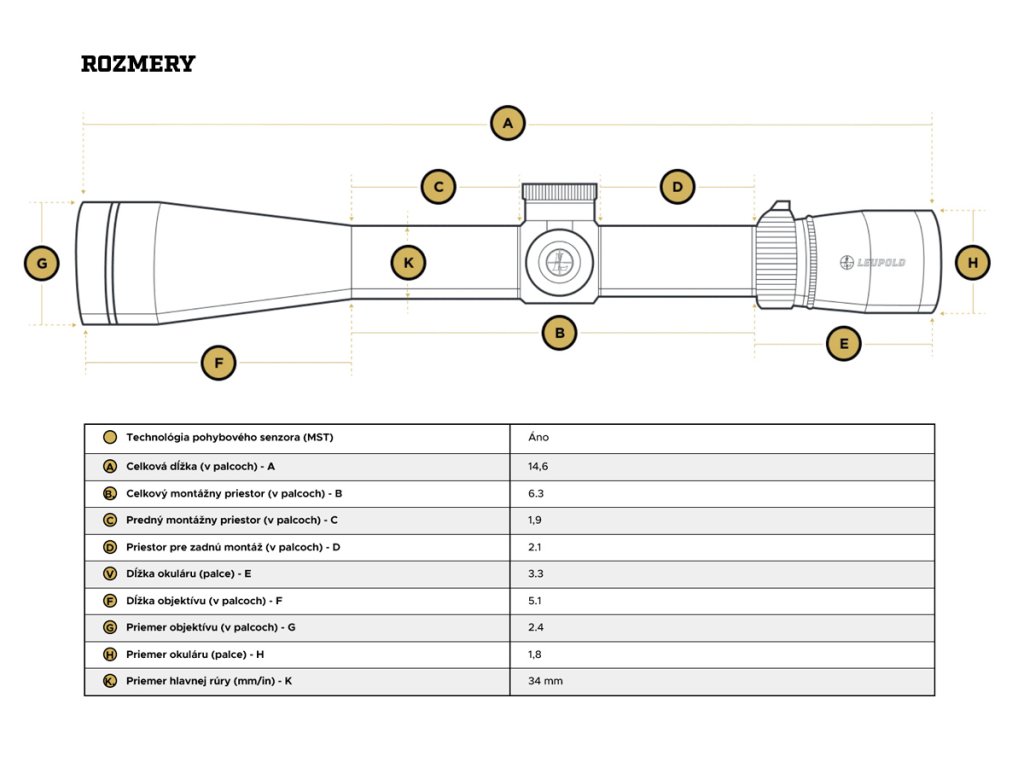 Parametre: Zväčšenie: 4.5-18x Objektív: 52 mm Osvetlený bod: áno, 8 stupňov intenzity Osnova: Illum. FFP PR-1MOA Typ batérie: CR2032 Hmotnosť: 765g Rozmery: A – celková dĺžka: 371 mm B – priestor pre montáž: 160 mm C – priestor pre montáž vpredu: 48 mm Viac na: https://www.leupold.com/mark-4hd-4-5-18x52-m1c3-side-focus-ffp-illum-pr1-moa-riflescopeDodatočné parametre