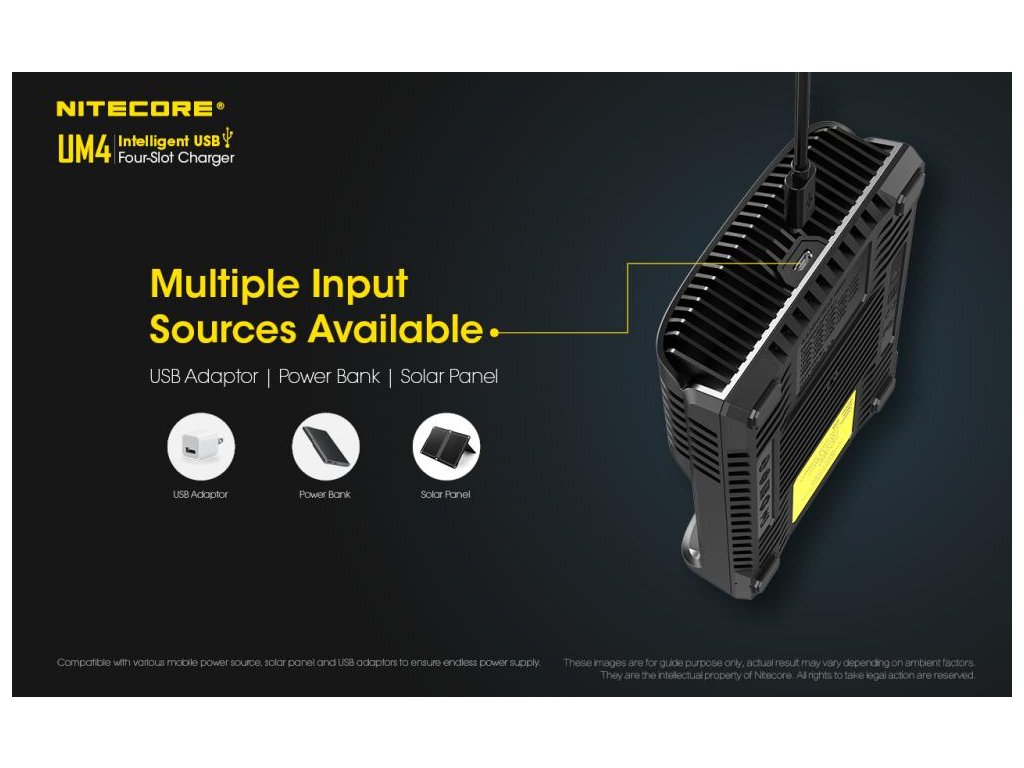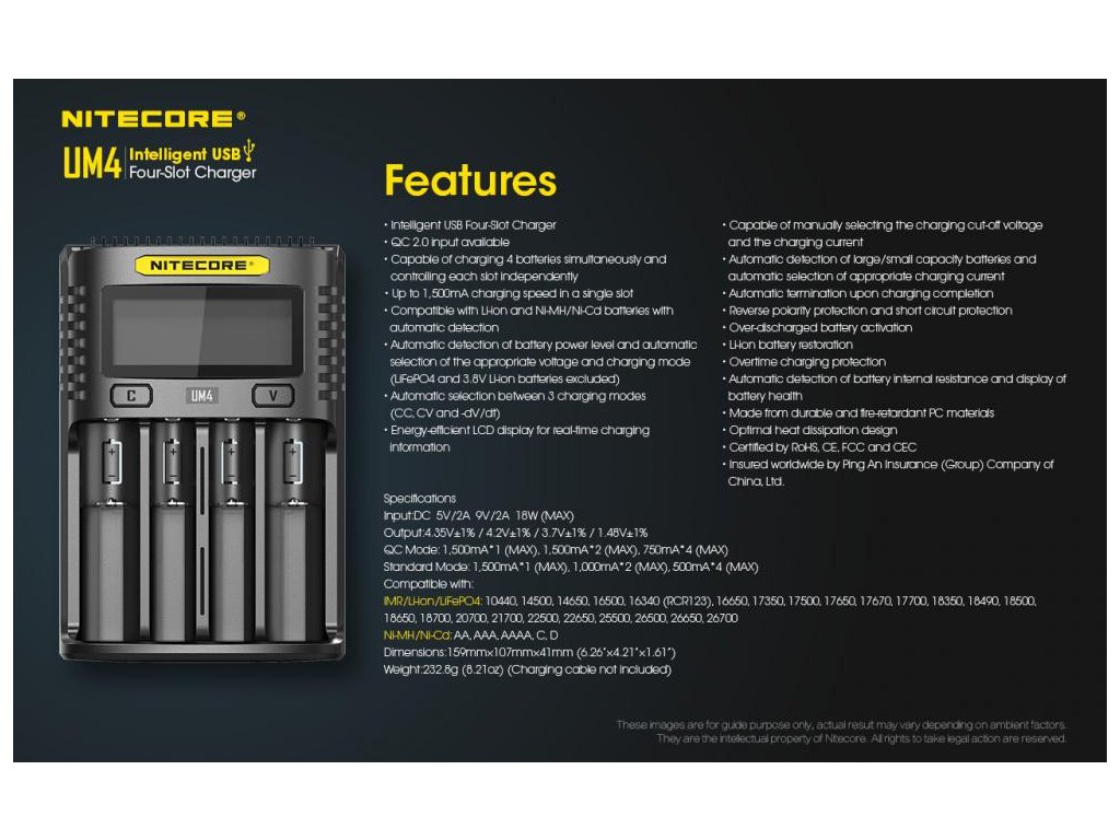 -USB nabíjačka na Li-ion akumulátory. -LCD s vysokým rozlíšením zobrazuje v reálnom čase stav nabíjania. -funkcia výstupu nabíjania USB. -integrovaný inteligentný systém riadenia výkonu. -inteligentne rozpozná príkon. -inteligentne rozdeľuje nabíjací výkon. -režim priority ponúka buď nabíjanie batérie,alebo nabíjanie cez USB. -umožňuje prenos dát cez USB. -inteligentne nastaví nabíjací prúd na základe kapacity batérie. -prispôsobená na navíjanie kábla vzadu a drážky pre uloženie 2,5mm/3.0mm kábla USB -vyrobená z nehorľavého materiálu. -funkcia ochrana proti prepólovaniu.-navrhnutá pre optimálny odvod tepla počas nabíjania. -certifikácia RoHS,CE,FCC a CEC. -vstupné napätie:: DC 5V/2A 9V/2A 18W (MAX) -výstupné napätie: 4.35V±1% / 4.2V±1% / 3.7V±1% / 1.48V±1% -výstupný prúd: QC Mode: 1,500mA*2 (MAX) -Standard Mode: 1,000mA*2 (MAX) -kompatibilné s: IMR/Li-ion/LiFePO4: 10440, 14500, 14650, 16500, 16340(RCR123), 16650, 17350, 17500, 17650, 17670, 17700, 18350, 18490, 18500, 18650, 18700, 20700, 21700, 22500, 22650, 25500, 26500, 26650, 26700, Ni-MH/Ni-Cd: AA, AAA, AAAA, C, D -hmotnosť: 232,8 g (bez batérií a napájacieho káblu) -rozmery: 152 mm × 107 mm × 41 mmDodatočné parametre
