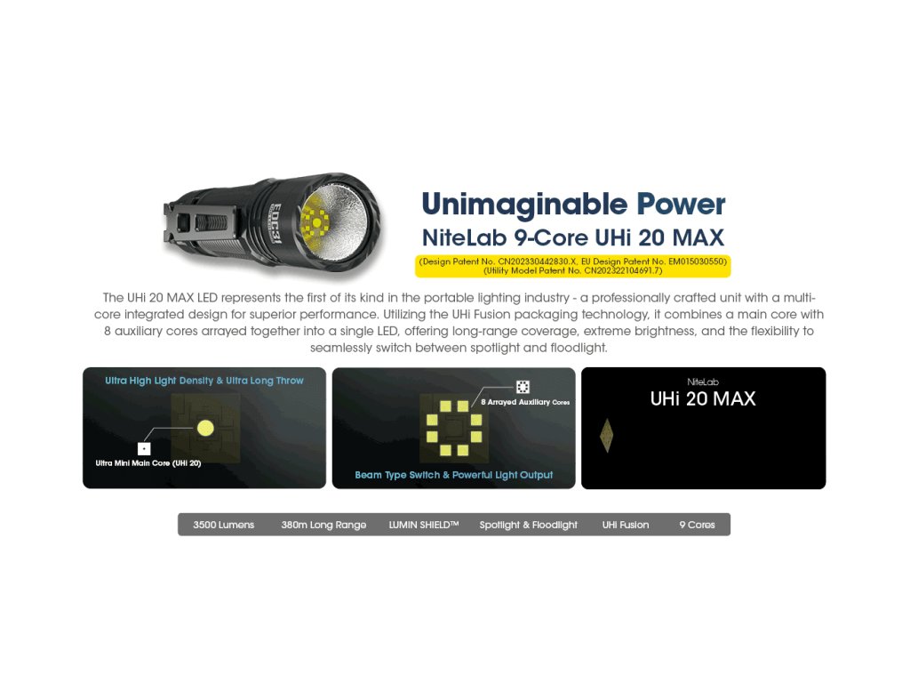 - Používa vysoko kvalitné NiteLab UHi 20 MAX- Maximálny výkon až 3500 lúmenov.- Vysoko efektívna elektronika.- Maximálna prevádzková doba až do 57 hodín.- Inteligentný nabíjací obvod s detekciou napätia, nabíja bezpečne a rýchlo.- Integrovaná zásuvka USB-C je odolná voči vode, prachu a nárazu.- Vybavená digitálnym displejom - režim, výdrž svietenia v dannom móde, - Funkcia inteligentnej pamäte ukladá posledné nastavenie jasu alebo módu.- Optimalizovaný, výnimočne presne navrhnutý reflektor poskytuje dlhší dosvit lúča ako konkurenčné produkty.- Svietidlo je vodotesné v súlade s normou IP68 (ponoriteľné do dvoch metrov).- Tvrdené extrémne číre minerálne sklo s antireflexným povlakom.- Vyrobené z hliníkovej zliatiny používanej v leteckom a kozmickom priemysle, potiahnutý titanovým povlakom.- Tvrdo anodizovaný HAIII povrch vojenskej kvality.- Ochrana proti prepólovaniu.- Spona z nehrdzavejúcej ocele.- Tvar zabraňujúci kotúľaniu sa.Dodatočné parametre