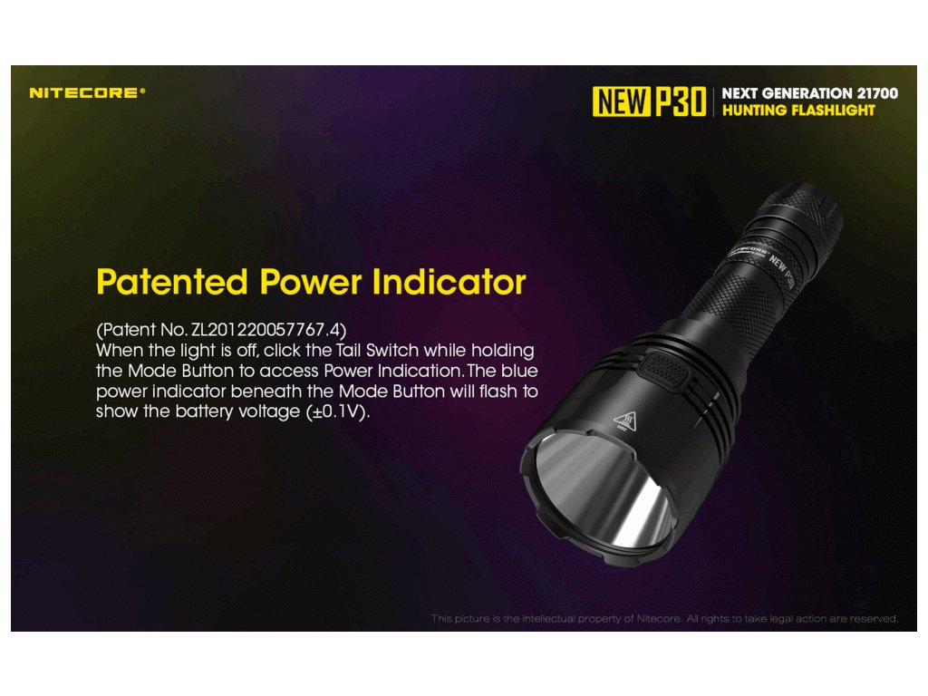 - Svietidlo používa batériu ďalšej generácie s označením 21700.- Používa vysoko kvalitnú LED diódu CREE XP-L HI V3 so svetelným tokom až 1000 lúmenov.- Má špičkovú intenzitu lúča 95 500 cd s dosahom do 618 metrov.- Má integrovanú „Precíznu digitálnu optickú technológiu“ (PDOT).- Svietidlo je napájané vysokokapacitnou Li-ion batériou typu 21700 a je kompatibilné aj s batériami typu 18650 a CR123.- Umožňuje prevádzku do 950 hodín.- Koncový prepínač a bočný prepínač umožňujú využívať 5 úrovní osvetlenia a 3 špeciálne režimy.- Dodáva sa s nabíjateľnou Li-ion batériou NITECORE 21700 s nabíjaním pomocou USB-C (NL2150R, 5000mAh).- Pod bočným prepínačom je svetelný indikátor zostávajúceho napätia batérie s presnosťou ± 0,1 V (patent č. ZL201220057767.4).- Vysoko účinný obvod konštantného prúdu poskytuje stabilný výkon svietidla.- Svietidlo má vstavaný obvod zdokonalenej tepelnej ochrany (patent č. ZL201510534543.6).- Má elektronickú ochranu proti prepólovaniu.- Má tvrdené extrémne číre minerálne sklo s obojstranným povlakom proti poškriabaniu.- Svietidlo je vyrobené z leteckej hliníkovej zliatiny s odolným tvrdo eloxovaným HAIII povrchom vojenskej kvality.- Svietidlo má ochranu typu IP68 (ponoriteľné do 2 metrov).- Je odolné proti pádu z výšky do 1 metra. Okamžité taktické zapnutie svietidlaKrátkodobé osvetlenie pri vypnutom svietidle aktivujete stlačením koncového vypínača do polovice a následným podržaním v tejto polohe. Pre vypnutie svietidla jednoducho uvoľnite stisk.Zapnutie/vypnutiePre zapnutie svietidla stlačte koncový vypínač kým nepočujete „kliknutie“. Pre vypnutie svietidla stlačte koncový vypínač po druhý raz, kým nepočujete „kliknutie“.Zmena úrovne osvetleniaPri zapnutom svietidle opakovane stláčajte bočný prepínač, aby ste prechádzali nasledovnými úrovňami osvetlenia: veľmi nízka - nízka - stredná – vysoká.Špeciálne režimy (STROBOSKOP/SOS/MAJÁK)- Pri zapnutom svietidle stlačte a podržte bočný prepínač režimov, aby sa aktivoval režim STROBOSKOP.- Keď je zapnutý režim STROBOSKOP, stlačte prepínač režimu a zapnú sa postupne v cykle režimy STROBOSKOP-SOS-MAJÁK.- Pre opustenie špeciálnych režimov jednoducho stlačte bočný prepínač a vrátite sa k posledne nastavenému jasu svietidla.Poznámka: Svietidlo P30 NEW má pamäť režimov. Keď reaktivujete svietidlo, zapne sa posledne nastavená úroveň osvetlenia, prípadne jeden z režimov STROBOSKOP, SOS alebo MAJÁK.Indikácia napätia- Keď je svietidlo vypnuté, stlačte súčasne koncový prepínač a prepínač režimov, vtedy sa začne indikácia napájania. Modrý indikátor napájania umiestnený pod prepínačom režimov bude blikať a ukazovať stav napätia batérie s presnosťou ± 0,1 V. Po tomto procese sa svietidlo automaticky zapne.Dodatočné parametre