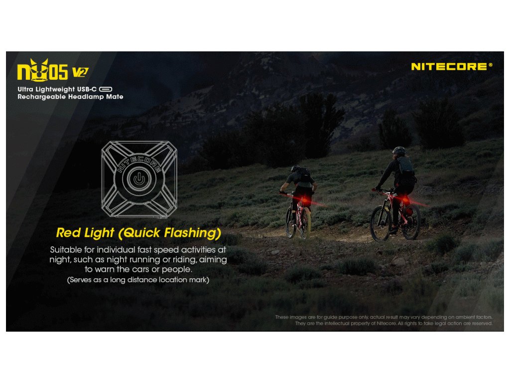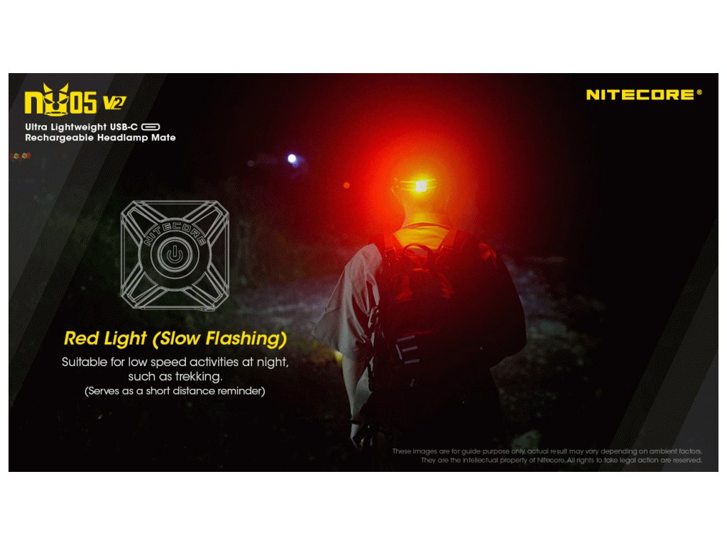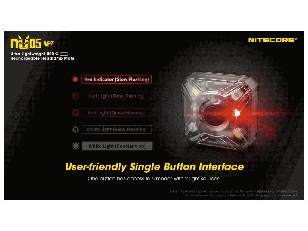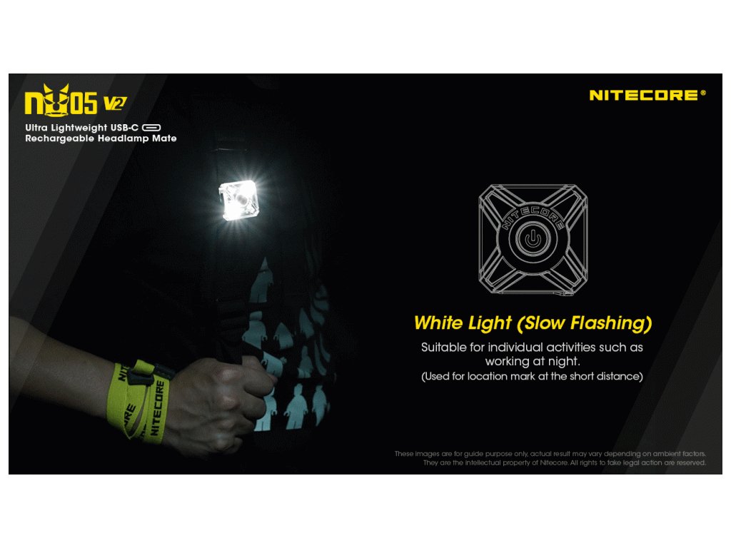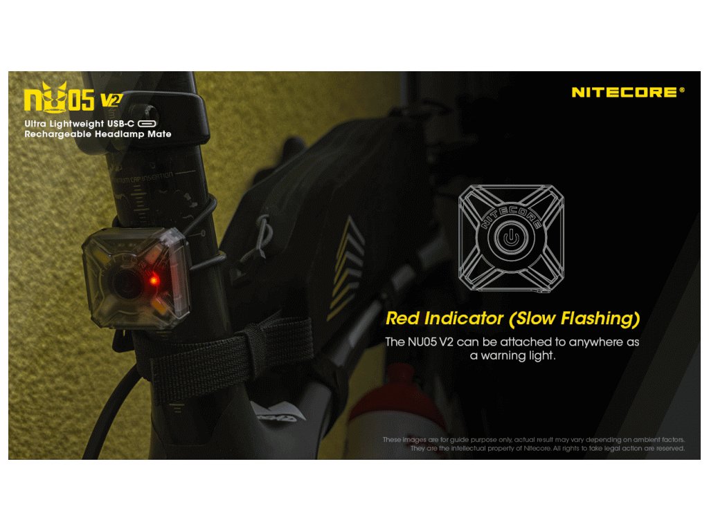 - Svietidlo (čelovka)je mini signálne a výstražné svietidlo na čelo.- Využíva 4 x vysokovýkonné LED diódy.- Má po dva zdroje bieleho a červeného svetla.- Vstavaná nabíjateľná Li-ion batéria zabezpečí max. dobu prevádzky až 47 hodín.- Má vstavaný inteligentný obvod nabíjania Li-ion batéries nabíjacím portom USB-C.- Má jeden prepínač ovládateľný jednou rukou.- Dostupné sú 4 špeciálne režimy.- Má aj zabudovaný indikátor napájania na indikáciu zostávajúceho stavubatérie.- Je vyrobené z odolného PC materiálu.- Je ultraľahké a má kompaktný dizajn.- Je odolné proti pádu z výšky do 1 metra. Zapnutie / vypnutieZapnutie: Keď je svietidlo vypnuté, krátkym stlačením tlačidla napájania ho zapnete a získate prístup k červenému indikátoru (pomaly bliká). Vypnutie: Ak do 3 sekúnd po zapnutí neprebehne žiadna operácia, znova krátko stlačte tlačidlo napájania a dostanete sa do standby režimu.Výber režimuNU05 V2 má 4 špeciálne režimy blikania a konštantné biele svetlo.Do 3 sekúnd po zapnutí krátko stlačte tlačidlo napájania, aby ste cyklicky prešli cez „Červený indikátor (pomalé blikanie) – červené svetlo (pomalé blikanie) – červené svetlo (rýchle blikanie) – biele svetlo (pomalé blikanie) – biele svetlo (nepretržité svietenie). ) – pohotovostný režim“.Uzamknutie / OdomknutieUzamknutie: Keď svietidlo svieti, podržte tlačidlo napájania na 1 sekundu, čím ho vypnete a uzamknete. V režime uzamknutia indikátor raz zabliká, aby informoval používateľa pri každom stlačení tlačidla napájania.Odomknutie: V režime uzamknutia podržte tlačidlo napájania na 3 sekundy, čím sa svietidlo odomkne a získate prístup k červenému indikátoru (pomaly bliká).Indikácia napájaniaKeď je NU05 V2 v pohotovostnom režime, podržte tlačidlo napájania na 1 sekundu a indikátor napájania bude blikať, aby indikoval zostávajúcu energiu batérie:1. Zablikanie trikrát znamená, že výkon je vyšší ako 50 %;2. Dve bliknutia znamenajú, že výkon je nižší ako 50 %;3. Jedno bliknutie znamená, že zostatkový výkon je menší ako 10%.Dodatočné parametre