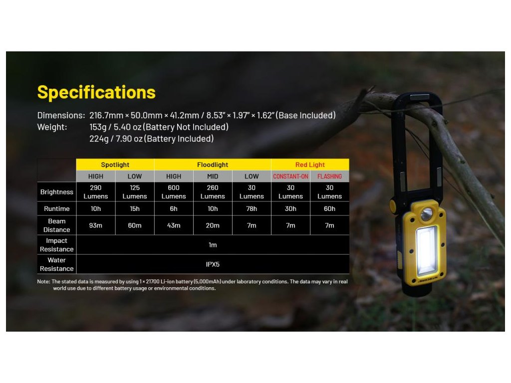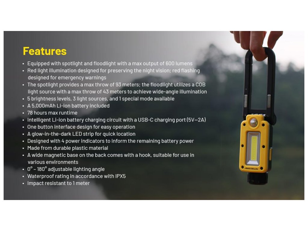 - Maximálny výkon až 600 lúmenov.- Vysoko efektívna elektronika.- Maximálna prevádzková doba až do 78 hodín.- biele a červené svetlo- Magnet v zadnej časti- Svietidlo je nepremokavé v súlade s normou IPX-5 (ponoriteľné do dvoch metrov).Dodatočné parametre