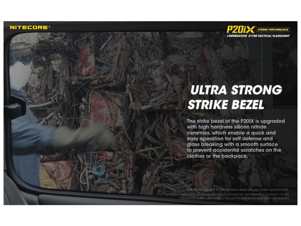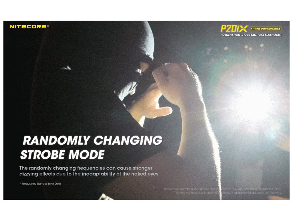 - Svietidlo využíva 4x vysoko kvalitné LED diódy CREE XP-L2 V6.- Optický systém je kombinovaný s „Precíznou digitálnou optickou technológiou“ (PDOT).- Svietidlo má intenzitu lúča 12 200 cd s dosvitom lúča do 221 metrov.- Vysoko výkonný prúdový obvod umožňuje prevádzku až do 350 hodín.- Dvojitý zadný prepínač (napájania a režimov) umožňuje jednoduché použitie pri taktických operáciách.- Svietidlo má STROBE Ready prepínač režimov pre rýchly prístup k režimu „stroboskop“ (chránené patentom č. ZL201320545349.4).- Režim stroboskop používa náhodne sa meniace frekvencie pre vyvolanie silnejších závratných účinkov.- Na svietidle je k dispozícii taktický režim a denný režim.- Svietidlo má inteligentný obvod nabíjania Li-ion batérií s portom USB-C.- Indikátor napájania vedľa nabíjacieho portu indikuje zostávajúce napätie batérie (patent č. ZL201220057767.4), môže zobrazovať napätie batérie s presnosťou (± 0,1 V).- Svietidlo má na prstenci v prednej časti tvrdé hroty zo silikón nitridovej keramiky, ktoré umožňujú rozbitie skla v prípade hroziaceho nebezpečenstva. -Svietidlo má integrovaný modul ATR (Advanced Temperature Regulation), automatickej regulácie teploty.- Optické šošovky svietidla majú obojstranný povlak odolný proti poškriabaniu.- Svietidlo je vyrobené z leteckej hliníkovej zliatiny s odolným tvrdo eloxovaným HAIII povrchom vojenskej kvality.- Svietidlo je vode odolné v súlade s normou IP68 (ponoriteľné do dvoch metrov).- Je odolné proti pádu z výšky do 1 metra. Funkcia nabíjaniaSvietidlo P20iX je vybavené inteligentným systémom nabíjania. Po vložení batérie a utiahnutí zadného krytu použite kábel USB na pripojenie externej nabíjačky (napr. USB adaptér alebo iné USB dobíjacie zariadenie) do nabíjacieho portu a spustí sa proces nabíjania.- Počas procesu nabíjania bude indikátor napájania pomaly blikať.- Keď je batéria úplne nabitá, P20iX zastaví proces nabíjaniaa indikátor napájania sa trvale rozsvieti, aby informoval používateľa.- Keď svietidlo svieti, po pripojení k zdroju napájania sa svietidlo automaticky vypne. Svietidlo sa opäť zapne po odpojení od zdroja nabíjania.- Doba nabíjania lítium-iónovej batérie 21700 (5 000 mAh) je približne. 3 hodiny 45 minút. (pri nabíjaní pomocou adaptéra 5V/2A).Taktické okamžité osvetlenie: Krátkodobé osvetlenie pri vypnutom svietidle aktivujete stlačením koncového vypínača napájania do polovice a následným podržaním v tejto polohe. Pre vypnutie svietidla jednoducho uvoľnite stisk.Zapnutie/vypnutie: Pre zapnutie svietidla stlačte koncový prepínač napájania pokým nepočujete „kliknutie“. Pre vypnutie svietidla stlačte koncový prepínač napájania po druhý raz, pokým nepočujete „kliknutie“.Obsluha svietidla: Svietidlo P20iX ponúka 2 užívateľské režimy osvetlenia pre rôzne situácie.- Denný režim (predvolené nastavenie): V tomto používateľskom režime je k dispozícii 6 úrovní jasu (TURBO, najvyššia, vysoká (850 lúmenov), stredná, nízka, ultranízka) a režim stroboskop. P20iX si pamätá 5 úrovní jasu (okrem TURBO) a režim stroboskopu po opätovnom zapnutí svietidla, ak nebolo prepnuté do iného režimu.- Taktický režim: V tomto režime sú k dispozícii iba 4 úrovne jasu (TURBO, vysoká (850 lm), stredná, nízka) a stroboskop. Svietidlo P20iX si zapamätá v tomto režime TURBO úroveň osvetlenia a stroboskop po opätovnom zapnutí, ak nebolo svietidlo prepnuté do iného režimu.Poznámka:: Pri použití batérií CR123/RCR123 existujú v dennom režime len 4 úrovne jasu (vysoká 1 060 lumenov, stredná, nízka, ultranízka) a stroboskop. V taktickom režime sú k dispozícii 3 úrovne jasu (vysoká 1 060 lúmenov, stredná, nízka) a stroboskop.Výber požadovaného režimu1. Dotiahnite úplne zadný kryt svietidla.2. Podržte stlačený prepínač režimov (STROBE READY) na koncovom kryte, svietidlo vstúpi do režimu TURBO alebo stroboskop, asúčasne uvoľnite koncový kryt.3. Hneď ako sa uvoľní koncový kryt, budú indikovať biele LED diódy zvolený užívateľský režim. Jedno bliknutie znamená denný režim a dve bliknutia znamenajú taktický režim.4. Uvoľnite prepínač režimov (STROBE READY) a utiahnite koncový kryt.Úrovne osvetlenia- Denný režim: Keď je svietidlo zapnuté, krátko stláčajte prepínač režimov (STROBEREADY) a budú sa cyklicky prepínať úrovne osvetlenia: ultranízka – nízka – stredná - vysoká - najvyššia.- Taktický režim: Keď je svietidlo zapnuté, krátko stláčajte prepínač režimov (STROBEREADY) na cyklické prepínanie úrovní jasu: TURBO – vysoká - stredná - nízka.Okamžitý prístup k TURBO úrovni osvetleniaDenný režim: Keď je svietidlo zapnuté, stlačte a podržte stlačený prepínač režimov (STROBEREADY),aby sa zapla úroveň TURBO (4 000 lúmenov). Uvoľnením tlačidla režimov sa vrátite do predchádzajúceho stavu.Poznámka: Pri použití batérií CR123/RCR123 sa sprístupní vysoká úroveň osvetlenia (1 060 lúmenov).Priamy prístup k stroboskopickému režimu- Keď je svietidlo v ktoromkoľvek používateľskom režime vypnuté, stlačte a podržte prepínač režimov (STROBE READY) prezapnutie stroboskopu. Uvoľnením tlačidla sa stroboskop vypne.- Keď je svietidlo zapnuté v ktoromkoľvek používateľskom režime, trikrát stlačte prepínač režimov (STROBEREADY), aby ste zapli stroboskop. Krátkym stlačením prepínača režimov (STROBEREADY) sa vrátite k predchádzajúcej úrovni osvetlenia. Prípadne vypnite svietidlo vypínačom a svietidlo si zapamätá nastavenie na stroboskop po opätovnom zapnutí svietidla.- Taktický režim: Keď je svietidlo zapnuté, nadlho stlačte prepínač režimov (STROBEREADY ™), aby ste zapli stroboskop. Krátkym stlačením prepínača režimov (STROBEREADY)sa vrátite k pr