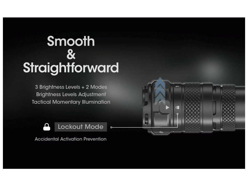 - SRT6i je svietidlo napájané batériou 21700i, má dostupný režim uzamknutia a využíva inteligentný otočný prstenec 4. generácie.- Dva koncové prepínače (napájania a režimov) umožňujú intuitívne ovládanie, špeciálne navrhnuté na presadzovanie práva, pre poľovníctvo a pre taktické aplikácie.- Na svietidle je prvý krát vo svete použitá 4. generácia technológie SSR (Smart Selector Ring) na prepínanie a rýchlu voľbu úrovní jasu a režimov.- Využíva vysoko výkonnú LED s maximálnym svetelným tokom 2 100 lúmenov.- Má optický systém kombinovaný s kryštálovým povlakom a technológiou PrecisionDigitalOpticsTechnology“ (PDOT).- Maximálna intenzita lúča je 65 200 cd a maximálny dosvit 510 metrov.- Maximálna doba prevádzky je 70 hodín.- K dispozícii sú 3 úrovne osvetlenia, režim uzamknutia a režim TAC.- Technológia STROBE READY™ umožňuje rýchly prístup k režimu STROBOSKOP. (Patent č. ZL201320545349.4)- Svietidlo je vybavené indikátorom napájania.- Využíva inteligentný obvod nabíjania Li-ion batérie s portom USB-C.- Li-ion batéria NITECORE 21700i je súčasťou balenia (NL2150HPi 5 000 mAh).- Vysoko účinný obvod konštantného prúdu poskytuje stabilný svetelný tok.- Svietidlo má zabudovaný modul pokročilej regulácie teploty (ATR) (patent č. ZL201510534543.6).- Úderový krúžok v prednej časti SRT6i z nitridu kremíka (pevnej keramiky) slúži na sebaobranu, prípadne rozbitie skla a pod.- Optické šošovky sú pokryté obojstrannou vrstvou odolnou proti poškriabaniu.- Telo svietidla SRT6i je vyrobené z hliníkovej zliatiny leteckej kvality s tvrdo eloxovaným povrchom vojenskej triedy HA III.- Vodotesnosť a prachotesnosť je v súlade s IP68 (do 2 metrov ponoriteľné).- Je odolné proti protipádu z výšky do 2. metrov. Ovládanie svietidlaOkamžité taktické osvetlenieÚroveň jasu 1-3: Keď je svietidlo vypnuté, stlačte do polovice a podržte prepínač napájania, aby sa svetlo na chvíľu rozsvietilo. Uvoľnením prepínača ho vypnete.Režim TAC:- Do polovice stlačte a podržte prepínač napájania, aby ste sa na chvíľu dostali na NÍZKU úroveň osvetlenia. Uvoľnením ho vypnete.- Úplným stlačením a podržaním prepínača napájania na chvíľu získate prístup k úrovni TURBO osvetlenia. Uvoľnením ho vypnete.Zapnutie a vypnutie svietidlaOsvetlenie úrovňou 1-3:- Keď je svietidlo vypnuté, stlačte prepínač napájania, až na doraz a svietidlo sa zapne.- Keď svietidlo svieti, stlačte opätovne prepínač napájania až na doraz a svietidlo sa vypne.Výber úrovne osvetlenia a užívateľského režimuKeď je svietidlo zapnuté, otáčaním krúžku inteligentného výberu na konci svietidla vyberte úroveň jasu a režimu.- Otáčaním krúžku inteligentného voliča v smere hodinových ručičiek úplne palcom doľava môžete prepínať medzi nasledujúcimi úrovňami jasov alebo režimami: TAC – TURBO (3) – stredná MID (2) – nízka LOW (1) – Režim uzamknutia.- Tieto úrovne jasu a režimy je možné prepínať aj opačným smerom otáčaním krúžku inteligentného výberu proti smeru hodinových ručičiek.- Keď otočíte krúžkom inteligentného výberu do režimu uzamknutia, obaprepínače budú zablokované a nebudú k dispozícii pre zapnutie svietidla.Okamžitý prístup k TURBO úrovni osvetlenia- Keď je svietidlo vypnuté, stlačte do polovice a podržte prepínačrežimov =MODE (STROBE READY), čím získate prístup k TURBO osvetleniu. Uvoľnením TURBO osvetlenie vypnete.- Úroveň jasu 1-2: Keď je svietidlo zapnuté, stlačte do polovice a podržte prepínač režimov = MODE (STROBE READY), čím získate prístup k TURBO. Uvoľnením sa vrátite do predchádzajúceho stavu.Poznámka: Úroveň TURBO osvetlenia pri aktivácii na dlhšiu dobu produkuje obrovské teplo a svietidlo automaticky zníži osvetlenie o niekoľko lúmenov, aby sa predišlo prehriatiu a aby sa predĺžila životnosť batérie.Priamy prístup k stroboskopu (STROBE READY )- Keď je svietidlo vypnuté, stlačte na doraz a podržte prepínač režimov = MODE (STROBE READY), aby ste sa dostali do režimu STROBOSKOP. Uvoľnením ho vypnete.- Úroveň jasu 1-3: Keď je svietidlo zapnuté, úplne stlačte prepínač režimov = MODE (STROBE READY), aby ste vstúpili do režimu STROBOSKOP. Opätovným krátkym stlačením prepínača režimov= MODE (STROBE READY) sa vrátite do predchádzajúceho stavu alebo vypnutím svietidla môžete ukončiť režim STROBOSKOP.Indikácia napájania- Keď je svietidlo zapnuté a zostávajúca kapacita batérie je cca. 50%, indikátor napájania bude blikať každé 2 sekundy, aby informoval používateľa. Keď je svietidlo zapnuté a zostávajúca kapacita batérie je blízka vybitiu, indikátor napájania bude rýchlo a nepretržite blikať, aby informoval používateľa.Dodatočné parametre
