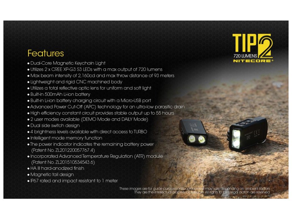 - Kvalitná LED dióda s maximálnym výkonom 720 lúmenov.- Vstavaná nabijacia Li-ion batéria umožňuje maximálnu dobu prevádzky až do 55 hodín.- Integrovaný inteligentný nabíjací obvod pre Li-ion batériu so vstavaným micro USB konektorom.- Dva multifunkčné prepínače na ovládanie všetkých funkcií.- Ovládanie funkcií jedným prstom.- Štyri úrovne intenzity osvetlenia a plynulý variabilný mód.- Telo je vyrobené z - Odolné proti nárazu z výšky 1,5 m.- Extrémne ľahký, kompaktný a ľahko prenosný.Dodatočné parametre