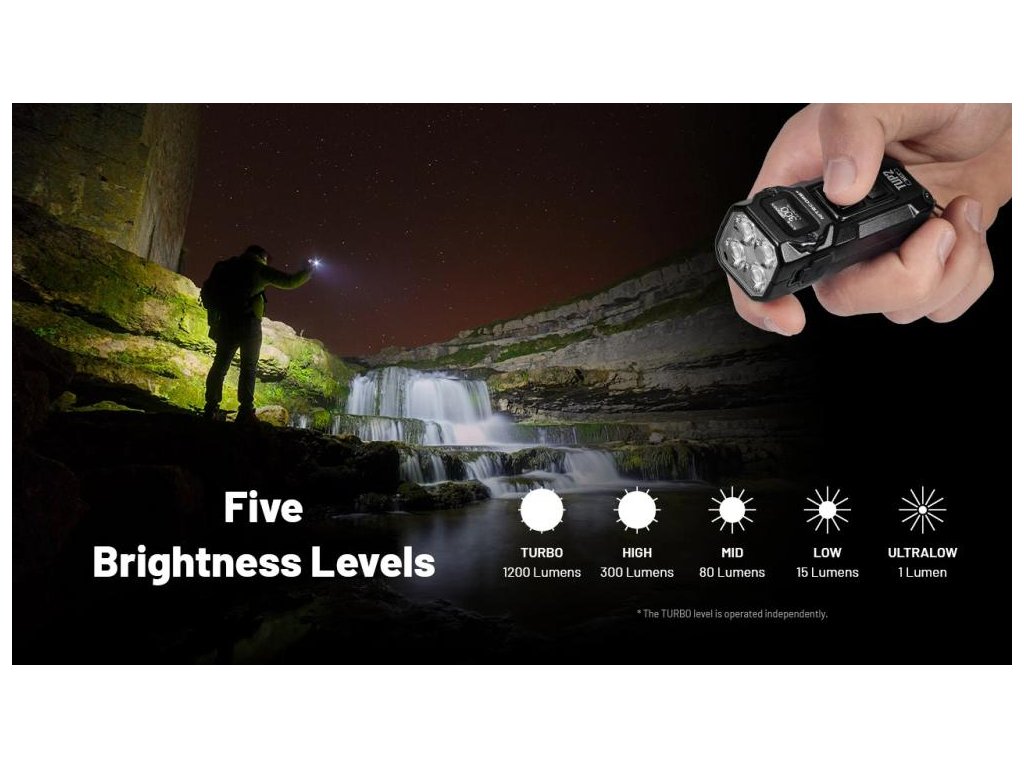 - Kvalitná LED dióda NiteLab MCT UHE LEDs s maximálnym výkonom 1200 lúmenov.- Vstavaná nabijacia Li-ion batéria umožňuje maximálnu dobu prevádzky až do 190 hodín.- Integrovaný inteligentný nabíjací obvod pre 1300 mAh Li-ion batériu so vstavaným USB-C konektorom.- Dva prepínače na ovládanie všetkých funkcií.- Ovládanie funkcií jedným prstom.- Päť úrovní intenzity osvetlenia.- digitálny displej: režim, lúmeny ...- Extrémne široký lúč svetla až 100°osvetluje veľký priestor.- Telo je vyrobené z hliníkovej zliatiny.- Dvojitý kovový úchyt pre krúžok na kľúče unesie záťaž až 30 kg.- Odolné proti nárazu z výšky 2 m.- Vodotesnosť: IP54- Extrémne ľahký, kompaktný a ľahko prenosný.Dodatočné parametre
