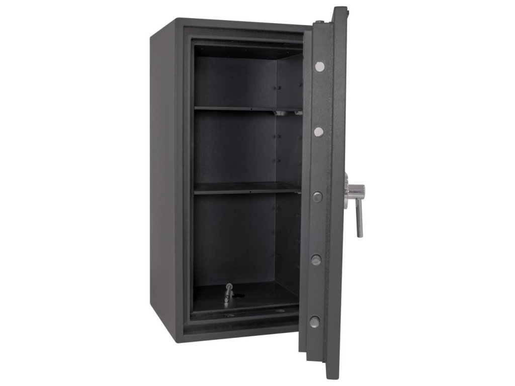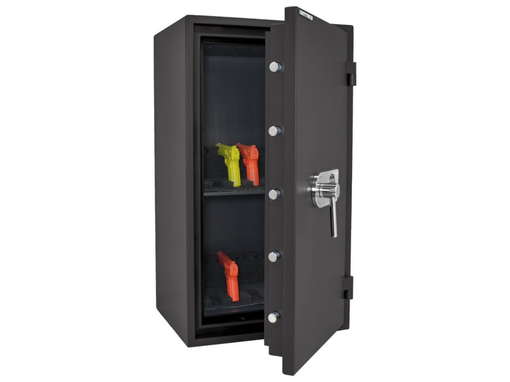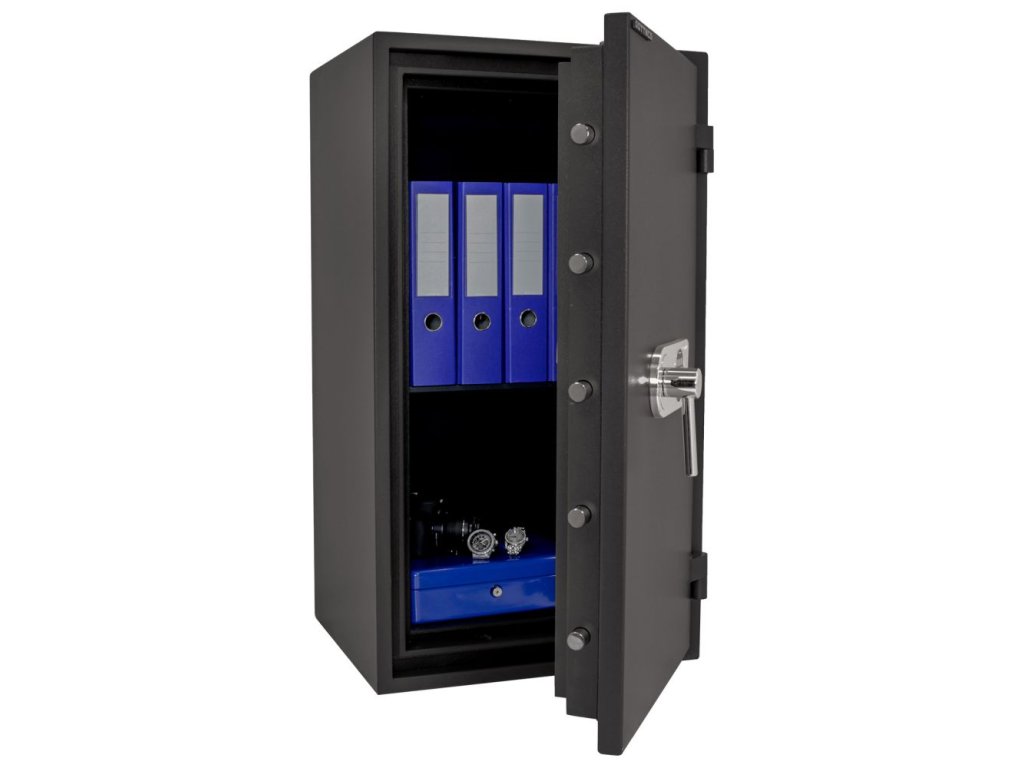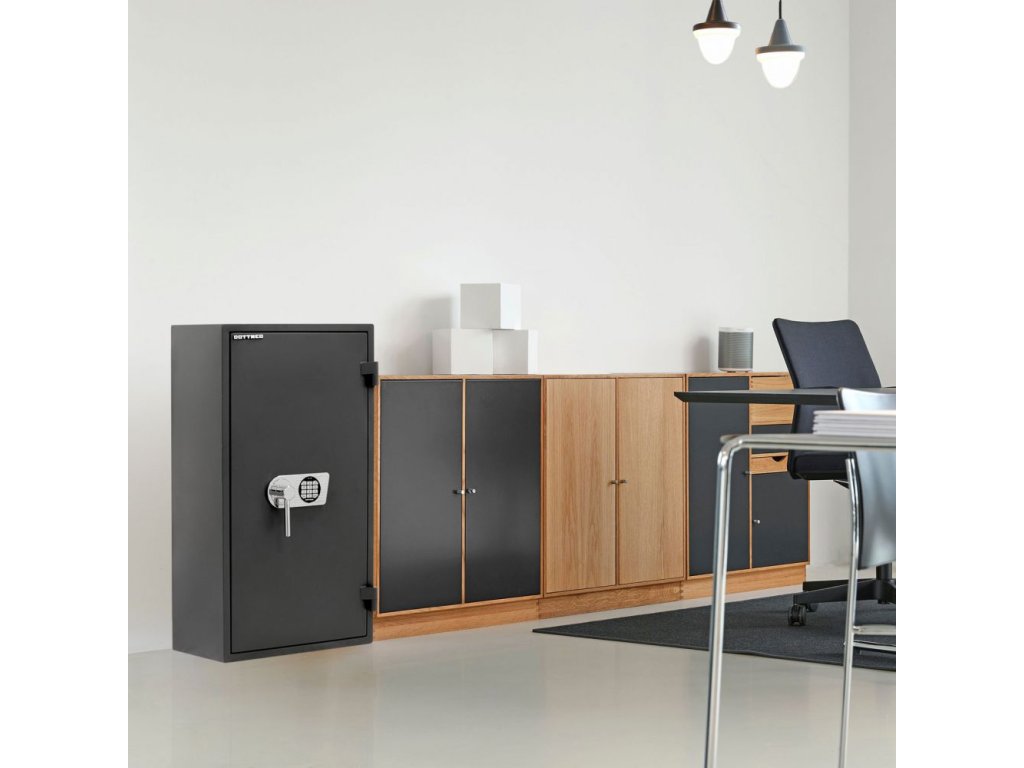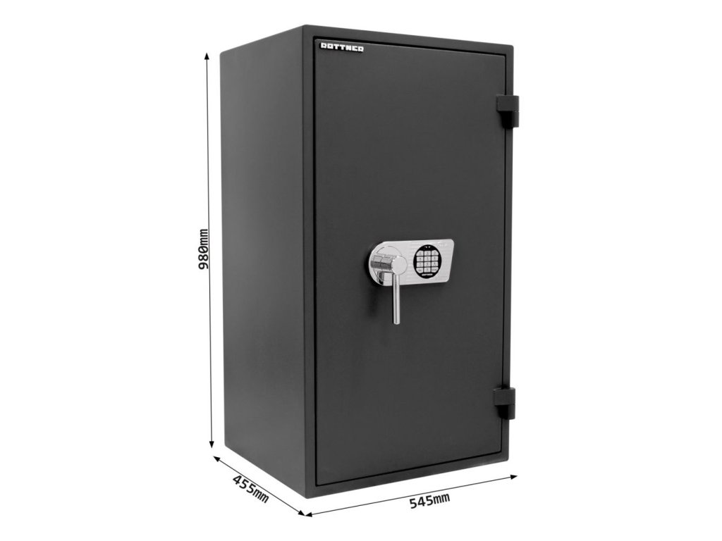 Model Fire Profi Premium EL 100 predstavuje nábytkový trezor, ktorý poskytuje maximálnu ochranu vašich cenností, dokumentov, šanónov ale aj krátkych zbraní. S certifikovaným elektrickým zámkom sa nemusíte báť, že by vaše cennosti boli odsudzené. Zámok je napájaný pomocou 9 V batérie. Naviac, trezor nesie aj certifikát o bezpečnostnej triede EN 1 podľa ECB S EN 1 1143 1. V prípade nečakaného požiaru dokáže tento trezor odolávať ohňu po dobu 60 minút. K zvýšeniu bezpečnosti pred ohňom chráni trezor aj špeciálna betónová výplň medzi stenami trezora. Pohodlné a rýchle vkladanie a vyberanie cenností zaručujú dvere, ktoré sa otvárajú až v 180° uhle. Aby ste si mohli všetky veci usporiadať podľa vašich predstáv, v trezore sa nachádza polička, ktorá je nastaviteľná. Spodná časť trezora je vybavená vopred pripravenými otvormi na upevnenie k podlahe. Materiál na upevnenie je súčasťou balenia.