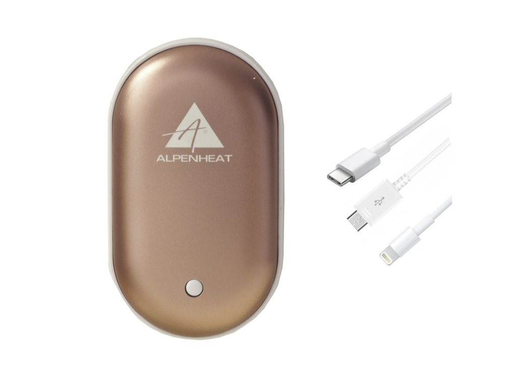 Je zima a ste na ceste domov z práce, zo školy alebo z vianočného trhu? Máme pre vás ideálne riešenie. Ak je veľmi chladno, vaše ruky mrznú a navyše batéria vášho inteligentného telefónu práve skončila, tak stačí jednoducho pripojiť mobil priloženým USB káblom a vás smartfón môžete pohodlne nabíjať. ALPENHEAT navrhol ideálne riešenie: Power Bank s funkciou ohrevu rúk! Váš malý, praktický a štýlový pomocník v chladných zimných dňoch. Power Bank je dodávaná s nasledovným typom USB káblov: Lightning USB-C, Micro USB.