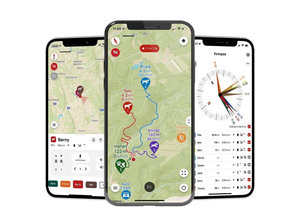 - Zobrazenie všetkých zariadení (psi, ďalší psovodi, waypointy) v mape