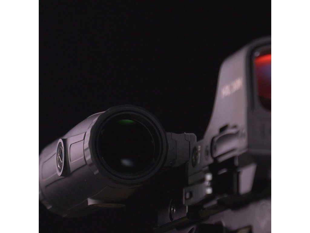 Zväčšovací modul HM3X s možnosťou vyklopenia a sklopenia. Disponuje veľkorysým očným reliéfom 7 cm, extrémne čistým sklom a nastaviteľnou dioptriou na kontrolu zaostrenia (+3 až -3). Možnosti montáže zahŕňajú integrovanú QD montáž s nastaviteľnou podložkou (spacer) pre zvýšenie optiky na nižšiu 1/3 co-witness. Bez inštalácie nastaviteľnej podložky je montáž 1/4 absolute co-witness. Modul je vyrobený z odolného duralu, plnený dusíkom. Antireflexná povrchová úprava optiky zvyšuje priepustnosť svetla a je zárukou vždy ostrého a čistého obrazu. Vďaka ostriacemu krúžku na okulári je možné prispôsobiť optiku zväčšovacieho modulu svojmu oku. Obe optické sústavy sa dodávajú v ABS kufríku. Výstuž kufríka chráni výrobok počas prepravy a skladovania a je presne prispôsobená tejto kombinácii produktov.