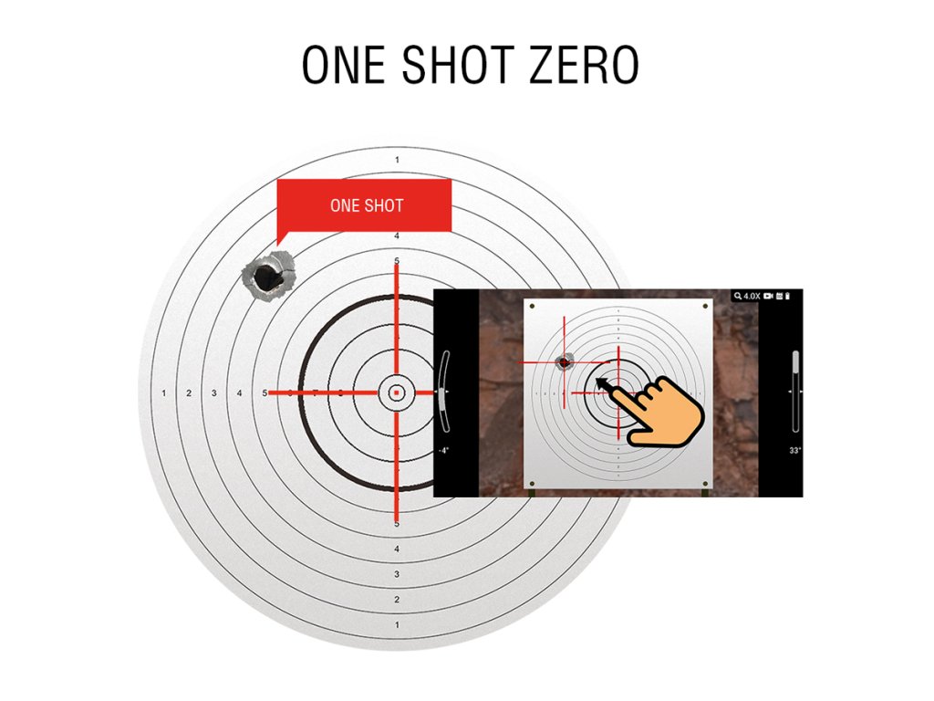 ONE SHOT ZERO - táto skvelá funkcia sa postará o to, aby nastreľovanie bolo jednoduché a rýchle. Stačí vystreliť na terč, v nastaveniach otvoriť funkciu Reticle a na základe osí X a Y nasmerovať zámerný bod tam, kde sa nachádza prvý vstrel. Následné uloženie zabezpečí presnú streľbu. Pre 100% istotu je možné vykonať skúšobný výstrel.
