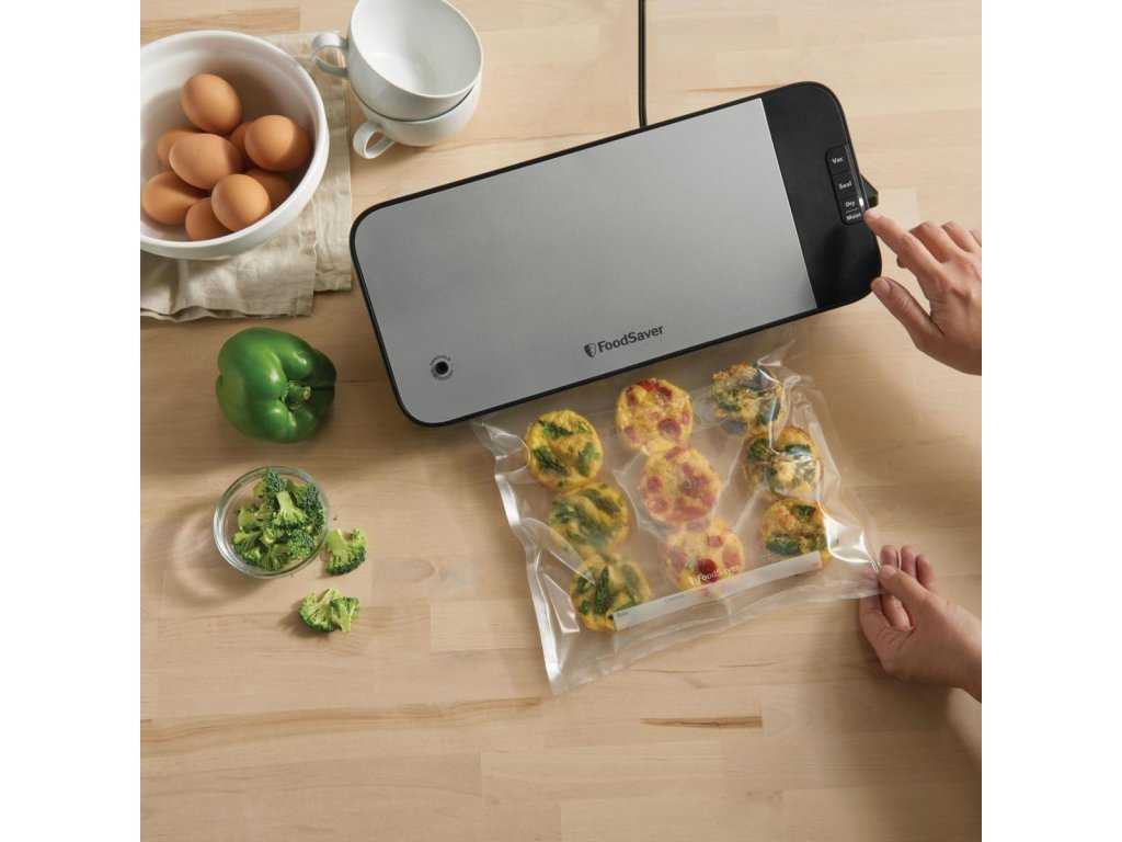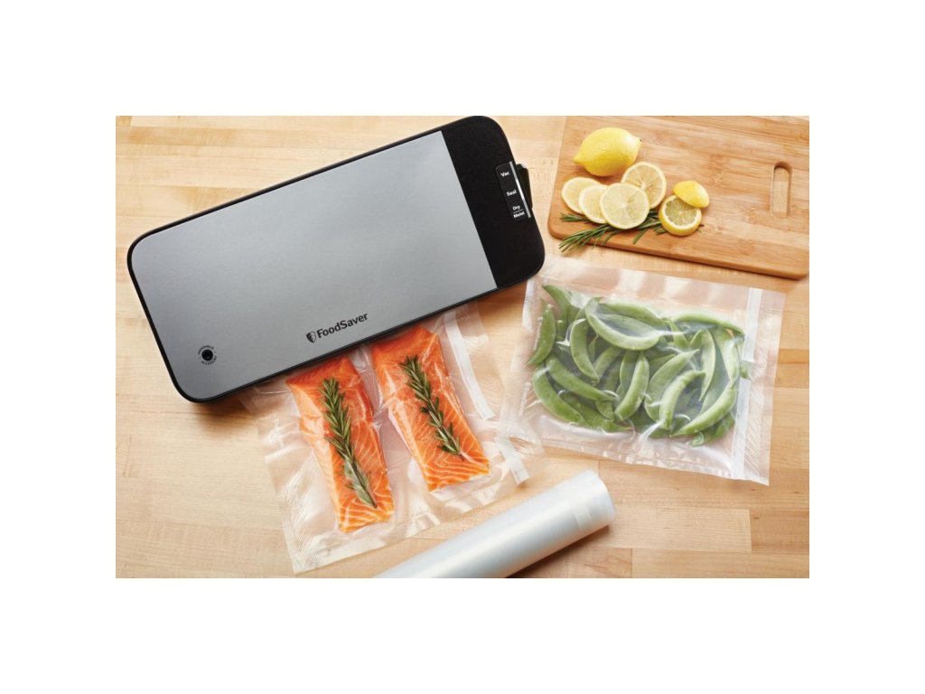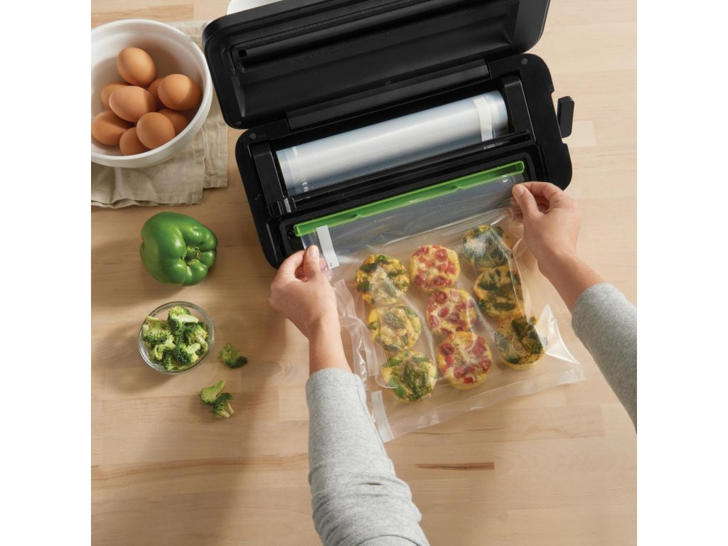 Vákuovačka, ktorá dokáže uskladniť všetko od suchých surovín cez zvyšky z chladničky až po mrazené jedlá, je ideálnym spôsobom, ako udržať potraviny dlhšie čerstvé. Zásobník na rolky a vstavaná rezačka uľahčujú používanie a všetko od malého občerstvenia až po zvyšky sa dá rýchlo a jednoducho uložiť.