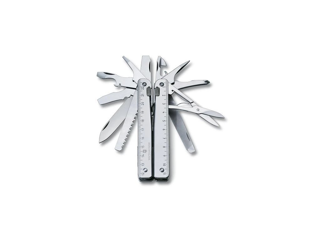 Multifunkčné náradie obsahuje: 1. tenké kliešte 2. skrutkovač 2 mm 3. skrutkovač 3 mm 4. nožnice na tenký a mäkký drôt až do 40 HRc 5. otvárač na fľaše 6. skrutkovač 6 mm 7. páčidlo 8. veľká čepeľ 9. nožnice 10. pilník na železo 11. pílka na železo 12. pílka na drevo 13. dierovač, výstružník 14. krížový skrutkovač 1+2 15. dláto a škrabka 16. čepeľ na pozdĺžne rezanie izolácie drôtov 17. ohýbač drôtov 18. odstraňovač izolácie drôtov 19. čepeľ na točité rezanie izolácie drôtov 20. otvárač na konzervy 21. viacúčelový hák 22. kožené puzdro 23. otvor na pripevnenie vývrtky 24. nožnice na tvrdý drôt 25. otvor na lanko 26. desať samostatných pružín 27. poistkaDodatočné parametre